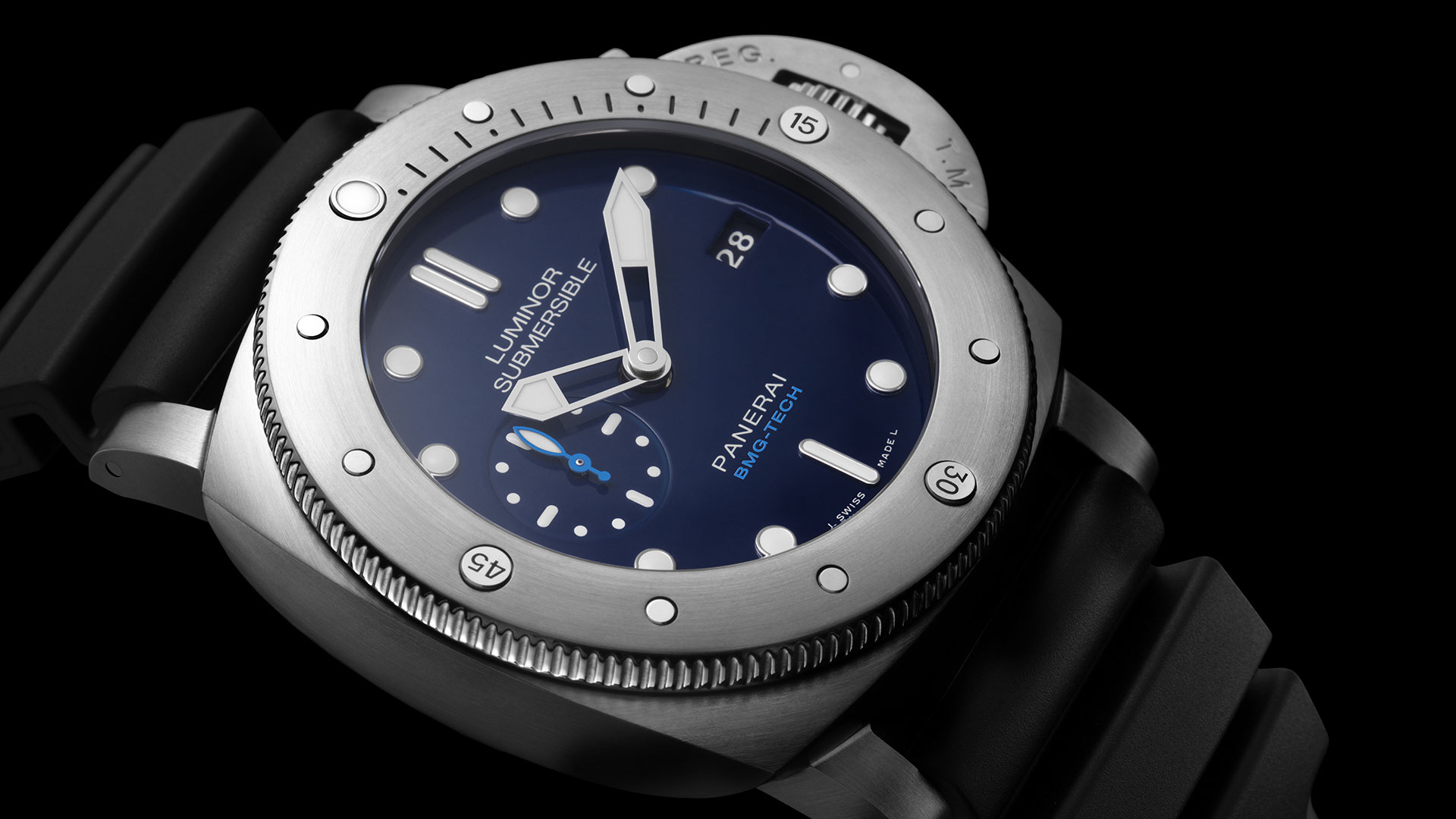 BMG-Tech case Panerai BMG-Tech Luminor Submersible 1950 3 Days Automatic copy watches are the most distinguished faces of Panerai. BMG-Tech is a bulk metallic glass with a disordered atomic structure, obtained through a high-pressure injection process at a high temprture, followed by a cooling process lasting for only a few seconds, so that the atoms do not have enough time to become arranged in an ordered.